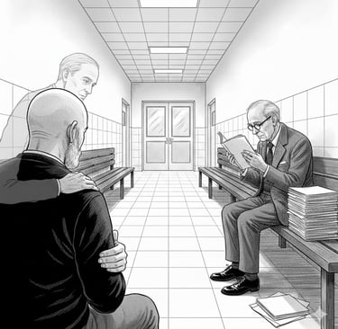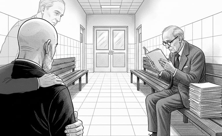 La antesala era un túnel de luz blanca, casi clínica, y estática. El aire pesaba, cargado de ese olor a biblioteca vieja y humedad que suele acompañar a las sentencias definitivas. Dos bancos largos de madera, uno frente al otro, se estiraban contra las paredes hasta morir en una puerta doble de vidrios esmerilados. No había nadie más, salvo un amigo cuyo rostro no lograba precisar, pero su mano apretaba mi hombro con una insistencia rítmica, como tratando de bombearme un valor que se me escapaba por los poros.