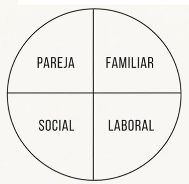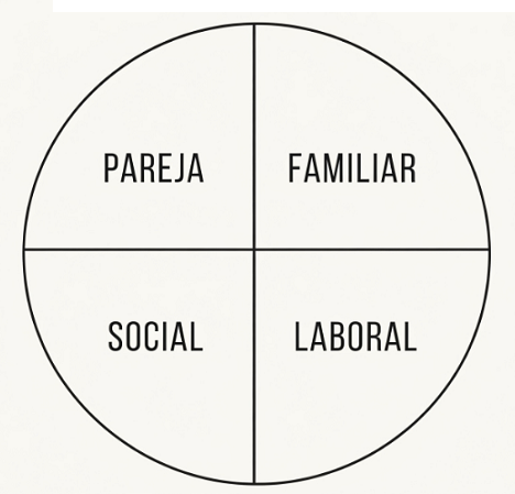 Imagina una pizarra. El profesor dibujó un círculo grande y lo dividió en cuatro partes iguales con una cruz que se unía justo en el centro. Nuestra sorpresa creció cuando, dentro de cada cuarto, escribió una palabra. Al final, el diagrama se veía así: PAREJA, FAMILIAR, LABORAL, SOCIAL.